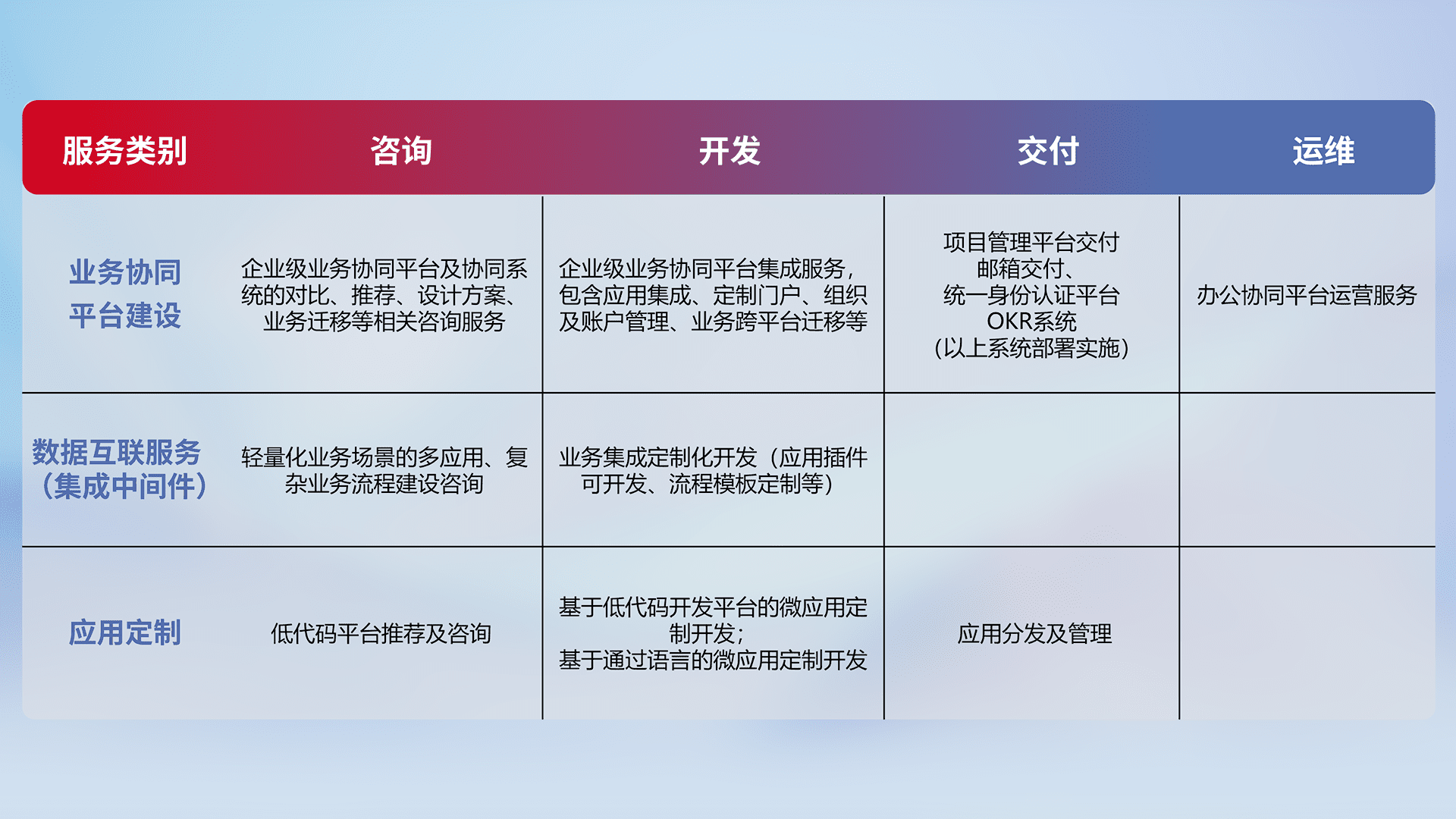 针对钉钉、、、、企微、、、、IDaas等平台级产品提供产品的规划、、、、方案、、、交付、、定制化开发等服务,,,,实现如统一协同办公、、、、智能客户服务、、、、混合会议管理、、、智能数据查询、、、等业务场景,,,实现数字化转型。。